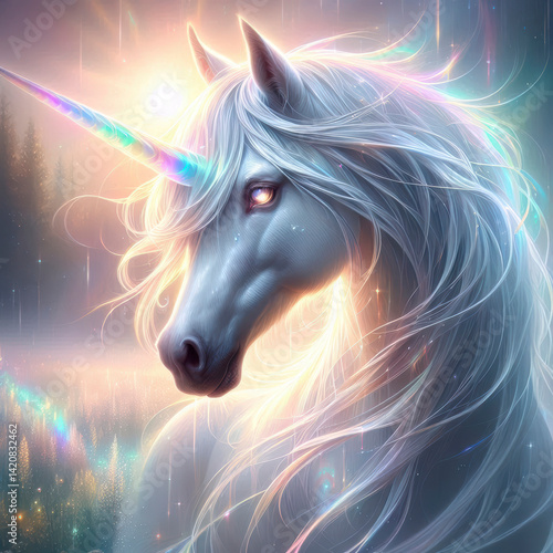 Magical Unicorn in a Dreamlike Forest, Glowing Mane and Horn, Fantasy Art, Fairytale Creature, Celestial Light