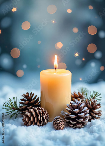 celebration, charming, christmas, festive, magical, pine cone, star, winter, ambience, bokeh, candle, cosy, decoration, enchanting, glowing, holiday, home decor, nature, seasonal, serene, snow, snowy, soft, tranquil, twinkling, warm