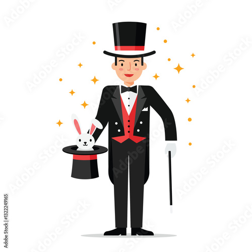 Magician performing tricks with a rabbit in a black hat, flat vector art
