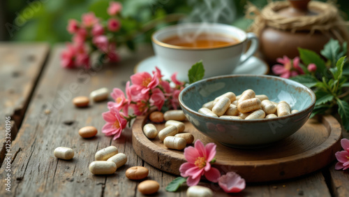 food and drink, wooden table, healthy lifestyle, antioxidant, floral arrangement, pink flower, alternative medicine