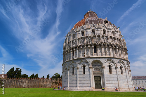 Magnificent daily view at the Pisa Baptistery of St. John, the largest baptistery in Italy, in the Square of Miracles (Piazza dei Miracoli), Pisa, Italy.