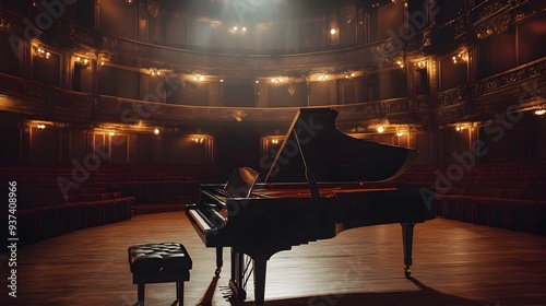 piano, concert hall, music, performance, instrument, stage, auditorium, venue, classical, grand piano, key, string, acoustic, melody, harmony, art, culture, entertainment, beauty, elegance, sophistication, atmosphere, ambience, dim, lighting, shadow, dramatic, serene, elegant, refined, majestic, imposing, impressive, grand, roomy, ornate, architecture, interior, design, decor, background, texture, pattern, geometric, abstract, acoustic, composer, orchestra, pianist