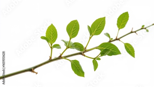 Magnified image of young leaves sprouting from slender branches on a clean white surface
