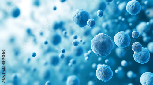 Magnified view of spherical blue cells floating in fluid. Intricate surface textures with visible pores or openings. Varying sizes and shades of blue create depth