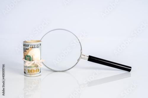Magnifier and usd banknotes.