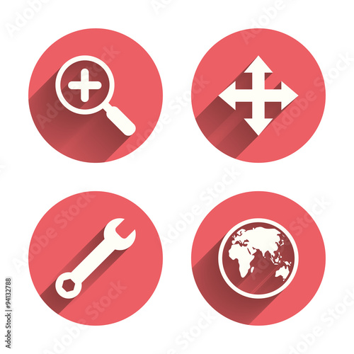 globe, zoom, magnifier, glasses, search, repair, tool, fix, wrench, service, arrow, plus, earth, earth, website, planet, travel, navigation, cyberspace, view, key, equipment, setting, icon, signs, buttons, symbol, flat, label, mark, token, shape, information, set, badge, app, vector, circle, shadow, long, pink, red, round, white