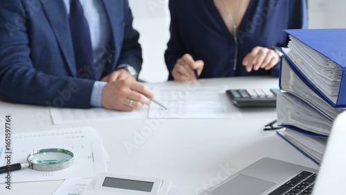 inspecting, tax, accountant, business, finance, man, woman, team, working, accounting, people, blue, analysis, datum, financial, report, teamwork, collaboration, office, desk, calculating machine, magnifying, glasses, document, paperwork, review, strategy, planning, investment, budget, tax, corporate, professional, adviser, adviser, research, examine, calculate, canvasses, statistic, economy, market, growth, profit, loss, income, expense, horizontal