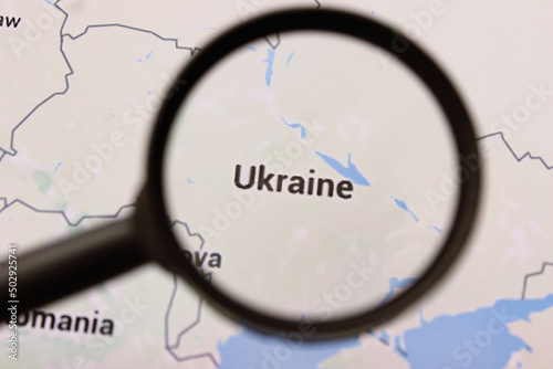Magnifying glass and map of Ukraine. Conflict between Ukraine and Russia February 24, 2022