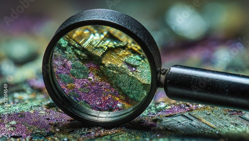 magnifying, glasses, mineral, specimen, colourful, closeup, detail, science, geology, crystal, rock, vibrant, texture, pattern, analysis, research, composition, layer, structure, speckled, fragment, intertwined, closeup, macro, element, surface, nature, view, sharpened, dark, metal, black, light, depth, contrast, design, beautiful