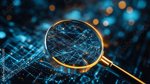magnifying glass, technology, night, sharpened, innovation, abstract, connection, exploration, brightness, pattern, futuristic, computer, design, communication, searching, information, science, analysis, zoom, illumination, grid, visualisation, tech, light, concept, research, clarity, depth, perspective, researching, global, connectivity, system, environment, cyber, digital, detail, overview, monitoring, study, discovery, scrutiny, exam