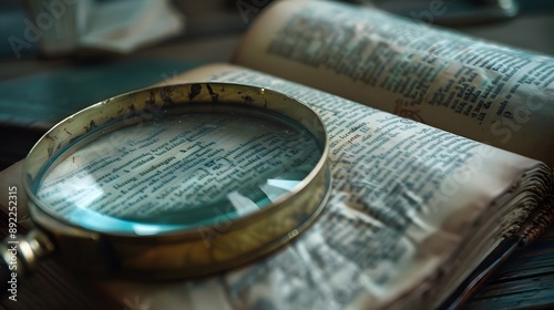 Magnifying glass on a book in a scholarly setting. Concept of search and discovery.