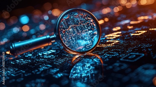 Magnifying Glass on Data Circuit Board: Exploring Digital Landscape
