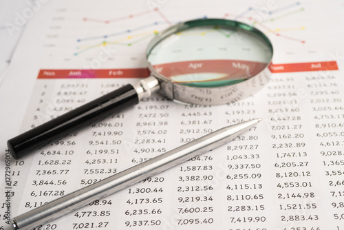Magnifying glass on spreadsheet and graph paper. Financial development, Banking Account, Statistic, Investment Analytic research data economy, Business.