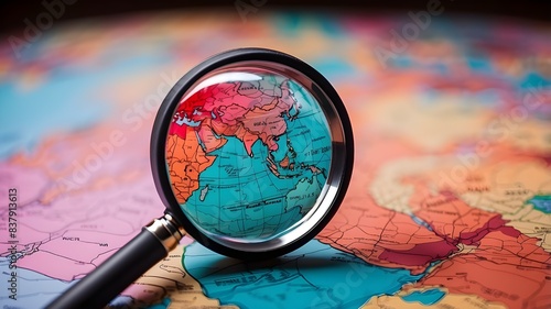 magnifying glass on the globe, magnifying glass on the world map, magnifying glass on the map of continent