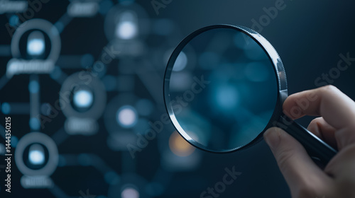 Magnifying Vision: A hand holds a magnifying glass, focusing on a complex network of interconnected nodes, symbolizing insight, analysis, and the quest for knowledge and clarity.