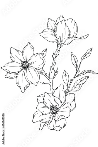 Magnolia Line Drawing. Black and white Floral Bouquets. Flower Coloring Page. Floral Line Art. Fine Line Magnolia illustration. Hand Drawn flowers. Botanical Coloring. Wedding invitation flowers