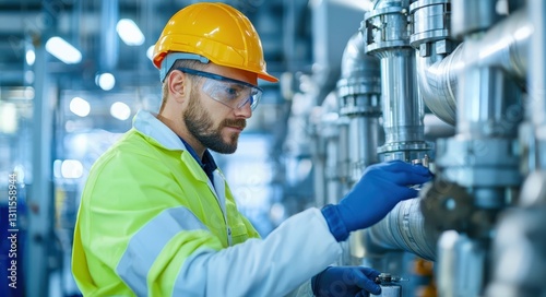 maintenance technical safety optimization concept. A worker in safety gear inspects machinery in a factory setting, highlighting industrial safety and operational efficiency.