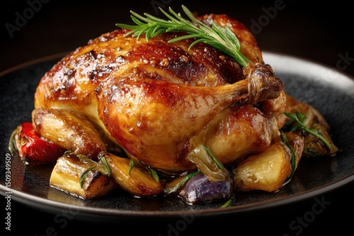 Maishähnchen Brathähnchen Ofengemüse Hähnchen mit Kartoffeln gebratenes Hähnchen Rosmarin Hähnchenfest Essen mit Gemüse Geflügelgericht rustikales Essen Sonntagsessen Festtagsbraten knusprig