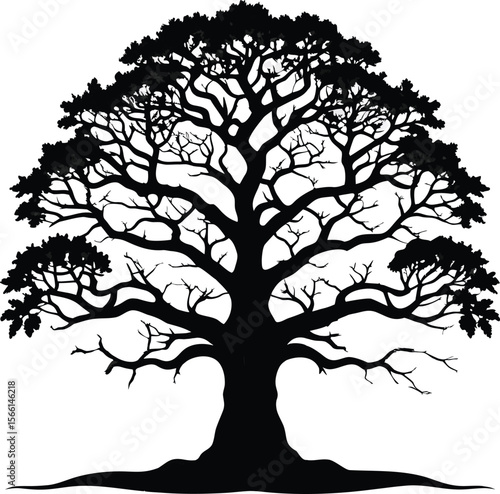 tree, silhouette, oak tree, nature, plant, black-and-white, isolated, tree branch, foliage, leaf, ancient, majestic, sprawling, organic, growth, botanical, timberland, forest, park, garden, landscape, symbol, icon, design element, vector, graphic, illustration, art, concept, element, outline