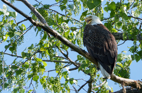 Majestic Bald Eagle (Haliaeetus Leucocephalus) keeping watch at nest over lake, Fishers, Indiana, Spring.
