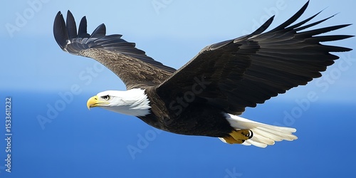 Majestic Bald Eagle in Flight Soaring Above Blue Sky Ocean Background Wildlife