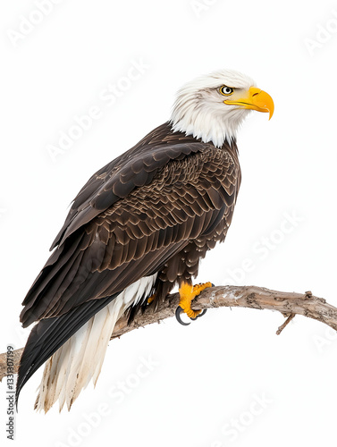 eagle, bald eagle, bird, bird of prey, wildlife, nature, animal, avian, predator, wild, freedom, power, majesty, american, symbol, national, bird of prey, fauna, feather, wing, talon, beak, eye, head, body, perched, tree branch, tree, white background, isolated, closeup, portrait, profile, view, majestic, powerful, impressive, soaring, flying, hunt, huntress, conservation, wilderness, patriotic