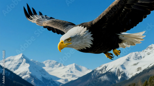 Majestic bald eagle soars in the clear sky over the snowy mountains