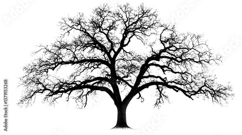 tree, oak tree, silhouette, black-and-white, winter, nature, branch, stark, strong, powerful, monochrome, graphic, design, artwork, art, background, isolated, single tree, leafless, twig, wood, trunk, root, graphic design, minimalist, elegant, dramatic, moody, serene, peaceful, landscape, botany, ecology, environment, black, white