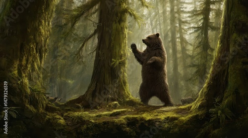 Majestic bear stands amidst a mystical forest.
