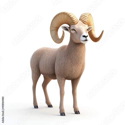 cute, sticker, three-dimensional, rendering, bighorn, sheep, jampacked, animal, wildlife, nature, mammal, horn, mountain, desert, plain, fauna, portrait, image, texture, fur, coat, standing, facing, forward, head, body, detail, render, computer, digital, realistic, representation, photo, closeup, light, shadow, beige, brown, tan, conservation, endangered, species, ecosystem, environment, protection