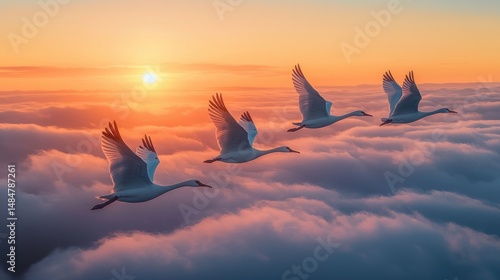 Majestic birds soar above clouds at sunrise