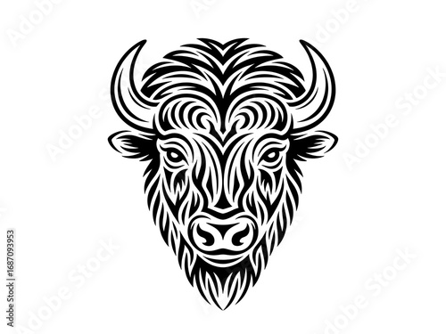 bison, buffalo, animal, head, tribal, tattoo, vector, illustration, mammal, wildlife, nature, design, art, graphic, symbol, strength, resilience, black-and-white, monochrome, bold, line, pattern, amerindian, western, mascot, logotype, icon, silhouette, decorative, drawing, engraving, artwork, line art