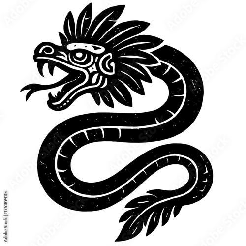 Majestic Black and White Illustration of Quetzalcoatl, the Iconic Mesoamerican Feathered Serpent Deity, a Powerful Symbol of Creation, Wind, and Wisdom in Ancient Aztec and Maya Mythology and Art