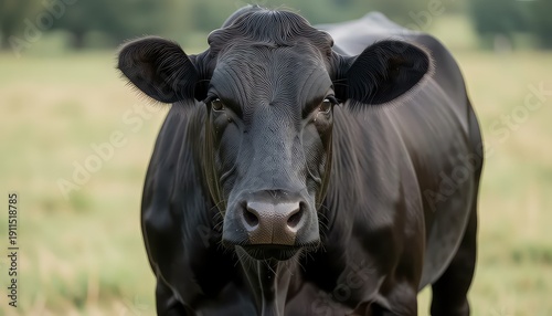 Majestic black cow standing in lush green pasture looking directly at camera
