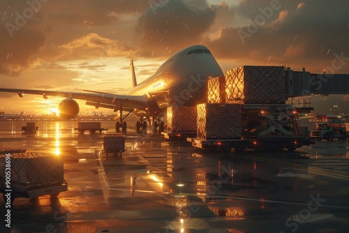 cargo, plane, sunset, tarmac, crate, loading, aerodrome, gold, sky, rain, droplet, shimmering, men at work, vehicle, ambience, serene, industrious, transport, logistic, aviation, freight, weather, evening, illumination, wet, aeroplane, package, shipping, commercial, twilight, glow, aerial, light, working, teamwork, metallic, machinery, rainstorm, baggage, load