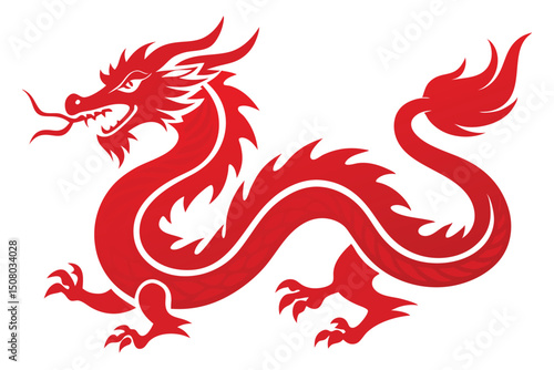 Majestic crimson dragon illustration curls, evoking traditional Asian mythology on a pure white background