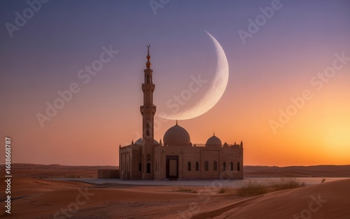 Majestic desert mosque at sunset with crescent moon glowing majestically over tranquil landscape