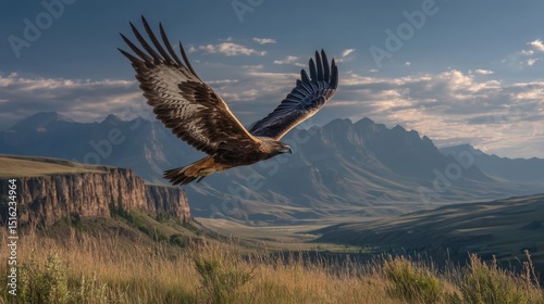 Majestic Eagle Soaring Over a Scenic Mountain Landscape at Sunset