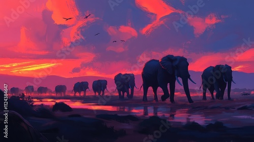 Majestic Elephants Walking Through Sunset Landscape in Nature