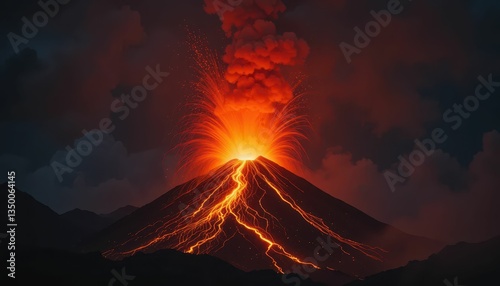 Majestic Eruption of Volcano with Fiery Lava and Smoke Clouds