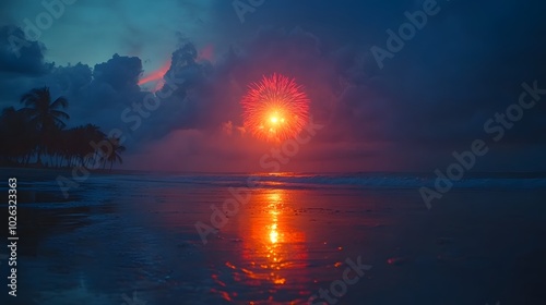 Majestic fireworks display over the ocean with reflections on the water
