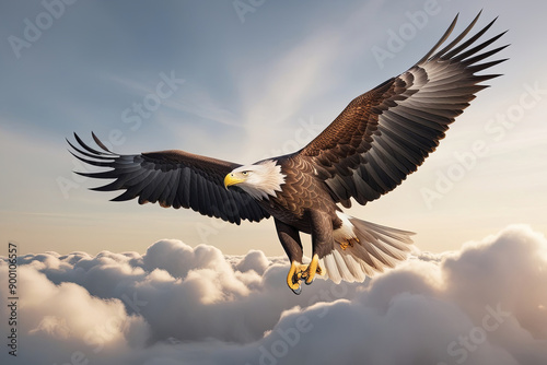 Majestic Fish Eagle soaring above cumulus clouds against a brilliant blue sky, conveying power, freedom, and serenity.