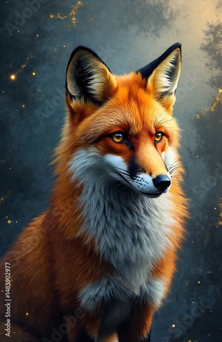 Majestic fox portrait with golden highlights, swirling background. Stunning wildlife representation. Fur detail, intense eye expression. Wilderness, elegance. Animal grace, beauty in portrait