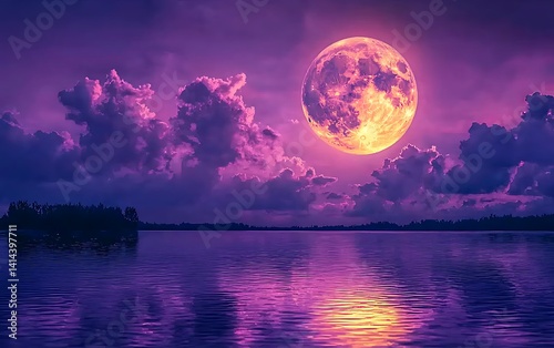 Majestic full moon rising over tranquil lake, reflecting in purple-hued water under vibrant sky
