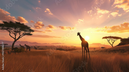majestic giraffe stands silhouetted against stunning sunset, surrounded by acacia trees and golden grasslands. serene landscape captures beauty of nature