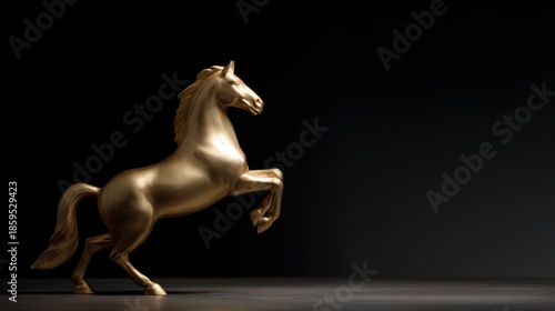 majestic golden horse sculpture rearing on black reflective background, strength success and elegance theme