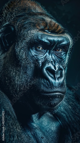 gorilla, dark, blue background, powerful, majestic, captivating, wildlife, nature, animal, primate, strength, intense, mysterious, nocturnal, solitary