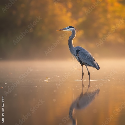Majestic great blue heron, shallow water reflection, golden hour light, soft focus background, nature photography, wildlife portrait, serene wetland scene, muted earth tones, misty atmosphere, high de