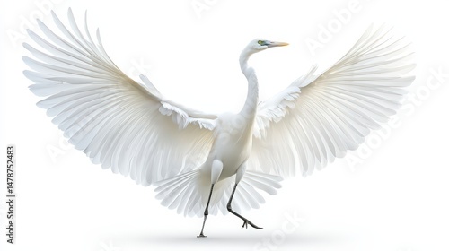 Majestic Great Egret Displaying Its Impressive Wingspan on White Backdrop