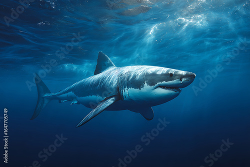Majestic Great White Shark Swimming in Deep Blue Ocean with Sunlight Filtering Through Water